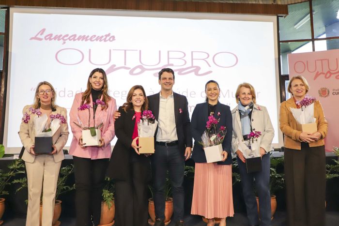O prefeito Eduardo Pimentel, ao lado da primeira-dama do município, Paula Mocellin, e da primeira-dama do Estado, Luciana Saito Massa, realizou o lançamento oficial da campanha Outubro Rosa